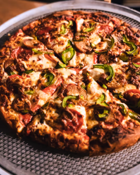 Mushrooms, pepperoni, ham, seasoned beef, onions, olives, green peppers