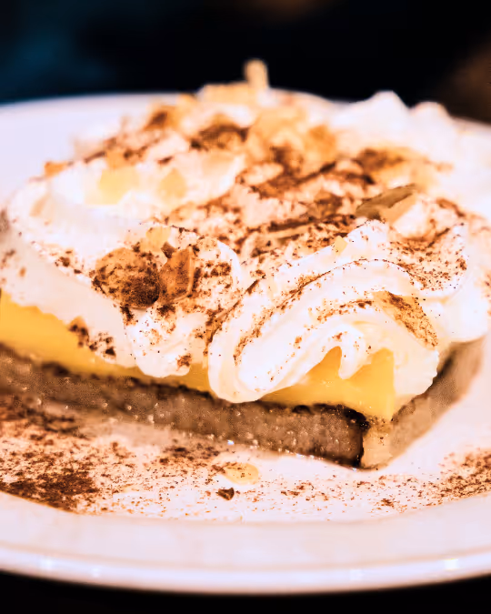 Toasted honey syrup base, with custard topped with whipped cream, almonds and cinnamon